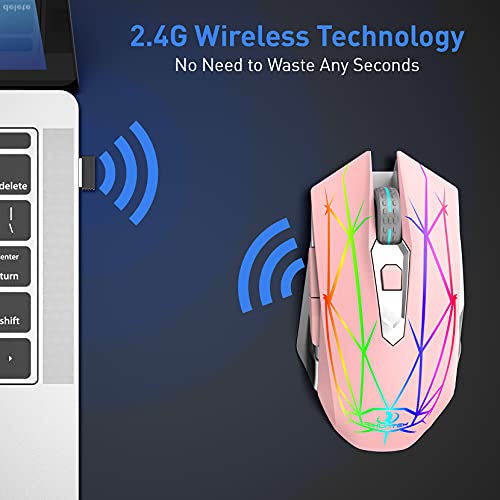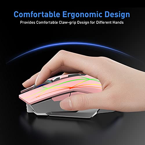RIIKUNTEK - Mouse wireless ricaricabile, mouse da gioco con 1600 DPI, pulsante laterale, ricevitore USB, luce RGB, mouse ottico ergonomico da 2,4 GHz, mouse silenzioso per PC portatile rosa