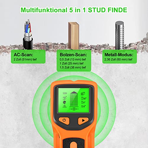▶【5 in 1 multifunzione Rilevatore】: La scansione delle viti prigioniere dispone di 5 modalità: scansione delle viti prigioniere da 1/2 pollice (13 cm), 1 pollice (25 mm) e 1,5 pollici (38 mm), scansione del metallo da 2,36 pollici (60 mm) e scansione AC da 2 pollici (51 mm). A seconda delle esigenze,è possibile passare alla modalità appropriata per individuare con precisione il centro e il bordo di legno, travetti o travi, linee di corrente alternata e metallo più profondo nella parete.