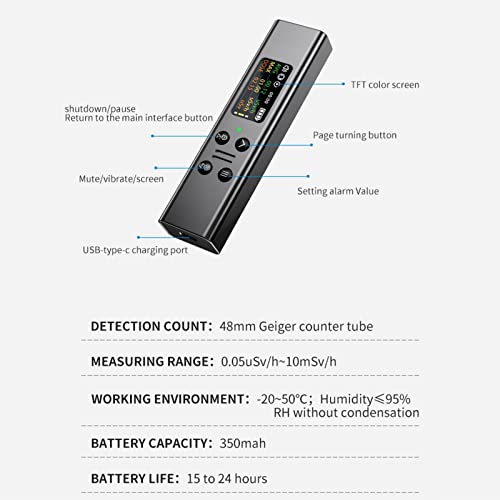 & 【Basso consumo energetico】 - con una potente batteria al litio ricaricabile da 350 mAh, il rilevatore di radiazioni richiede circa 1 ora per caricarsi e può misurare continuamente fino a 24 ore.