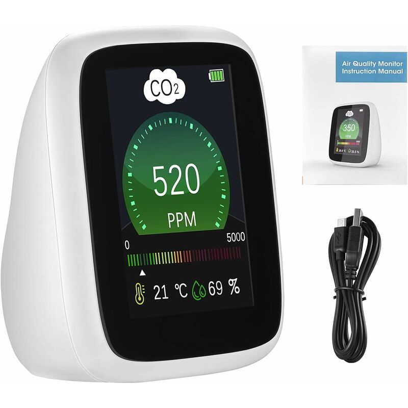 Elevata precisione: utilizzo del sensore Hyman, anti-interferenza multipla, calibrazione della compensazione della serra, design del foro di dissipazione del calore, misurazione più accurata, intervallo di misurazione 400-5000 ppm. Nota: la misurazione potrebbe essere inizialmente distorta e successivamente tornerà alla normalità. Alta qualità e durata: ricarica USB, 2 ore di ricarica, 5 ore di durata della batteria, ampio display LED a colori, d 1000 ppm regolabile allarme, fare doppio clic per attivare il suono. Rilevatore 3 in 1: il rilevatore di CO2 è in grado di rilevare concentrazione, umidità e temperatura di CO2 con molteplici funzioni e proteggere completamente il tuo ambiente di vita e quello della tua famiglia.< /p> Piccolo e portatile: Il rilevatore di CO2 misura 80 × 35 × 70 mm e pesa 150 g. È piccolo e portatile e può essere facilmente posizionato nel palmo della tua mano. Ampia gamma di applicazioni: i rilevatori di CO2 sono adatti per camere da letto, soggiorni