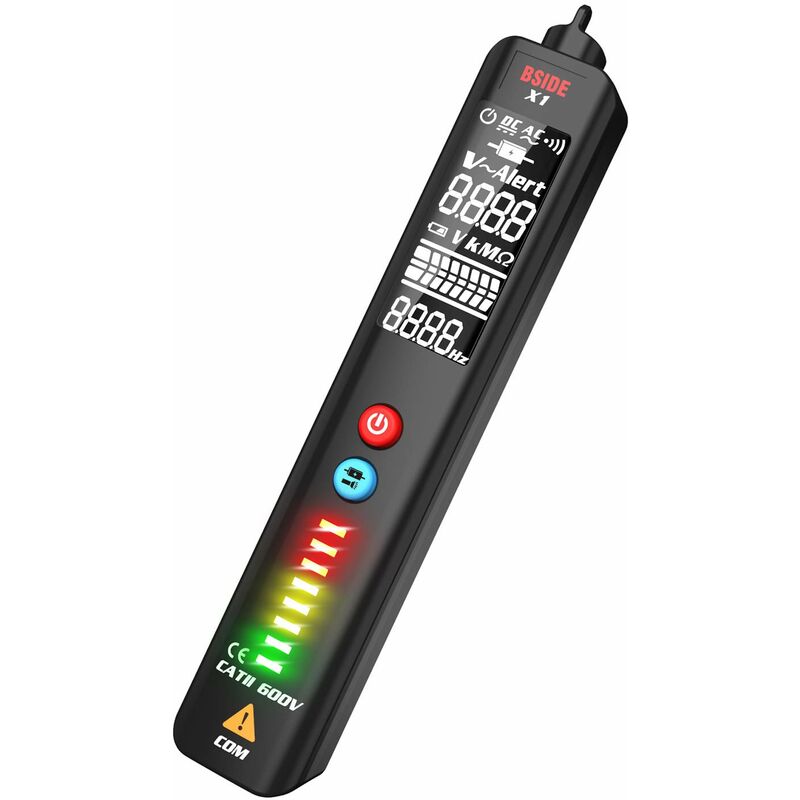 Schermo LCD: lo schermo LCD migliora notevolmente l'esperienza di lettura, i numeri e le lettere illuminati con sfondo nero lo rendono molto facile da leggere, anche alla luce diretta del sole o in condizioni di scarsa illuminazione. < p> 3 righe: il l'ampio display a tripla riga ad alta risoluzione può mostrare 3 risultati di test sullo schermo, tensione, frequenza e barra analogica. 8 indicatori LED: 8 indicatori LED in 3 colori facilitano la valutazione della tensione rilevata. Sensibilità regolabile: la sensibilità regolabile rende la misurazione più comoda, impostando una sensibilità bassa, puoi distinguere con maggiore precisione la situazione specifica in linee complesse. [Multimetro integrato]: il -Il design del multimetro con rilevatore di tensione non solo espande notevolmente le applicazioni di test, ma consente anche di non preoccuparsi che il multimetro consumi troppo spazio.