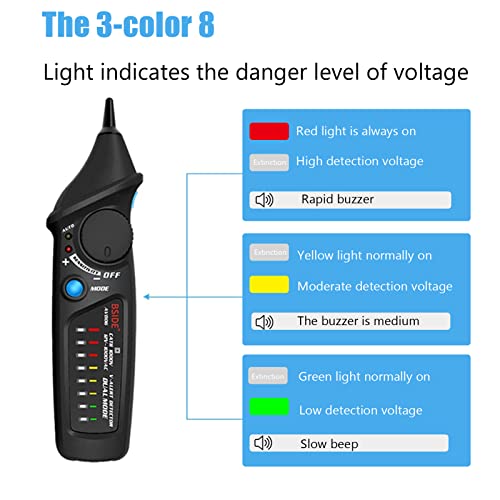 Rilevatore di tensione senza contatto - Chiamato anche penna di rilevamento della tensione. Utilizzando il principio del rilevamento induttivo, non è richiesto alcun contatto fisico. Molto sicuro e conveniente. Dispone di 8 indicatori LED in 3 colori (rosso / giallo / verde): identificazione automatica di alta / media / bassa tensione.