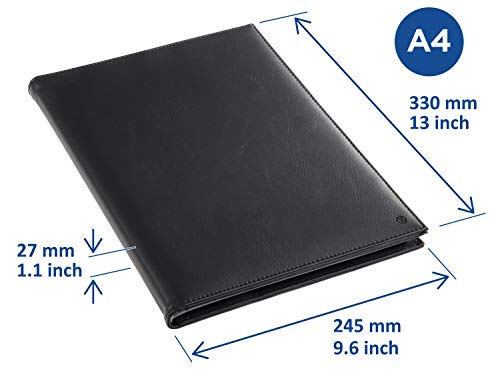 Nella parte interna sinistra sono presenti tasche per documenti A4/A5 e biglietti da visita. Nella copertina interna destra include un blocco note a righe orizzontali, formato A4 e 25 pagine