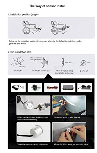 Facile da installare Questo prodotto viene fornito con strumenti per la tornitura dei fori e biadesivi. Questi strumenti possono essere utilizzati per aprire facilmente i fori del paraurti dell'auto e installare il sensore di parcheggio. Assicurarsi che i 4 sensori siano montati completamente orizzontalmente.