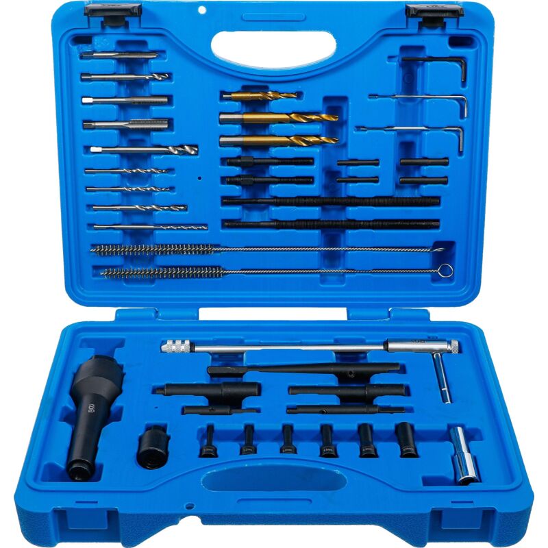 Per montare e smontare le candele di preriscaldamento e riparare in modo professionale le filettature di candele Filettatrice per ripassare la filettatura delle candele di preriscaldamento M8 x 1 e M10 x 1 Pulizia del foro del filamento incandescente nella testa del cilindro Supporto per maschiatori con funzione di cricchetto Oggetto della fornitura: 5 maschiatori 1/4 x 28UNF - 12 x 28UNF - M8 x 1,0 - M10 x 1,0 - M8 x 1,0 4 punte elicoidali 2,6 - 3,4 - 3,4 - 4,4 mm 3 punte a gradini per alesare le candele di preriscaldamento strappate 4,4 x 7 - 5,4 x 7 - 5,5 x 9 mm 2 perni di traino 2 mandrini di trazione 4 manicotti di centratura 2,6 - 3,7 mm 3 chiavi ad angolo esagono interno 2 - 2,5 - 3 mm 2 spazzole rotonde in acciaio 5 x 300 - 7 x 300 mm 2 supporti per maschiatori 1 dispositivo di centraggio con cuscinetto a sfera e mandrino di trazione 2 dadi del mandrino 2 portapunte elicoidali 1 manicotto di centraggio 1 manicotto estrattore 6 buss. serr.elett.candela di preriscaldamento, 6,3