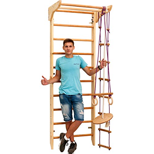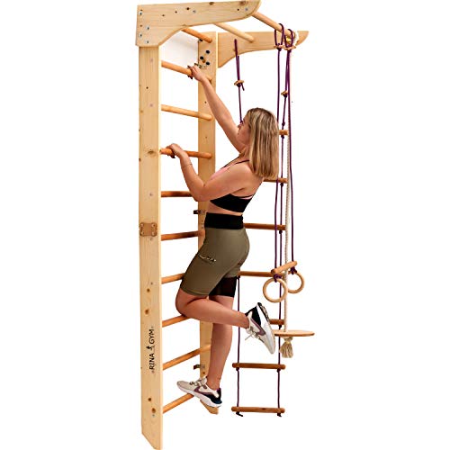 UN PARCO GIOCHI COMPLETO - Questa palestra da interno ha tutto ciò che troveresti al parco: anelli da ginnastica, sbarre, parete da arrampicata, spalliera svedese, trave removibile, scivolo e altalena.