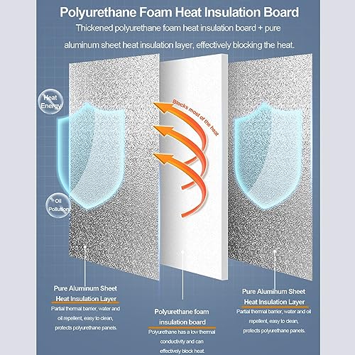 Materiale: il materiale principale del tappetino isolante termico è un pannello isolante in schiuma poliuretanica ispessita e uno strato isolante in lamiera di alluminio puro per bloccare efficacemente il calore. Design del pannello isolante ispessito con alluminio ispessito e rivestimento in metallo per una maggiore durata.