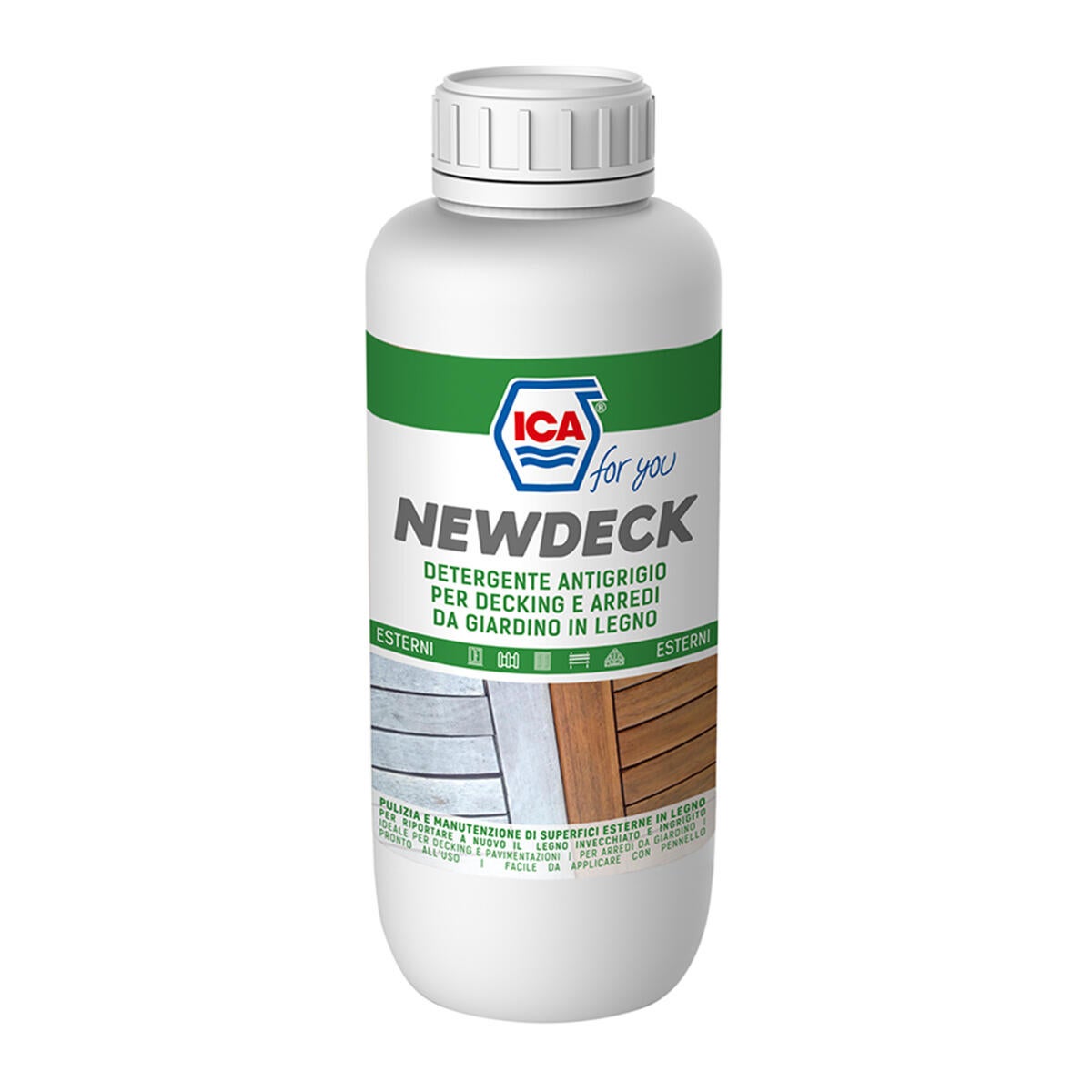 NEWDECK è un detergente per legno invecchiato ed ingrigito che elimina la patina grigia che si forma sul legno esposto all'esterno, riportandolo al colore originario. Particolarmente indicato per legni come Teak.. Indicato per rimuovere lo sporco superficiale ostinato e la patina che si forma in seguito all'invecchiamento dovuto dall'esposizione prolungata ai raggi UV. Particolarmente indicato per decking in legno e terrazze.. Adatto per ripristinare il decking in cattive condizioni prima di dare una nuova mano di ICADECK.. Pulizia e manutenzione professionale del legno.. Pronto all'uso.. Rinnova superfici in legno soggette ad invecchiamento causato da agenti atmosferici.