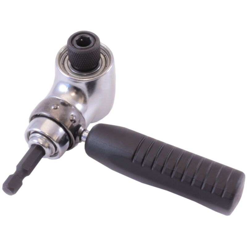 Adattatore da applicare a trapani. Con mandrino di blocco per inserti attacco (6,3 mm). Manico pivottante e serrabile in 8 diverse posizioni. Vine fornito con 1 inserto PH2 x 25 mm. Dimensioni 83 x 46 mm.