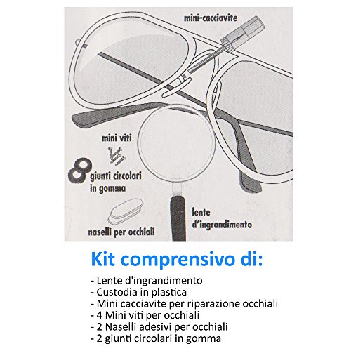 Il Kit è composto da: 1 lente di ingrandimento, custodia in plastica, mini cacciavite, 4 mini viti (di 2 dimensioni diverse), 2 naselli per occhiali e 2 giunti in gomma