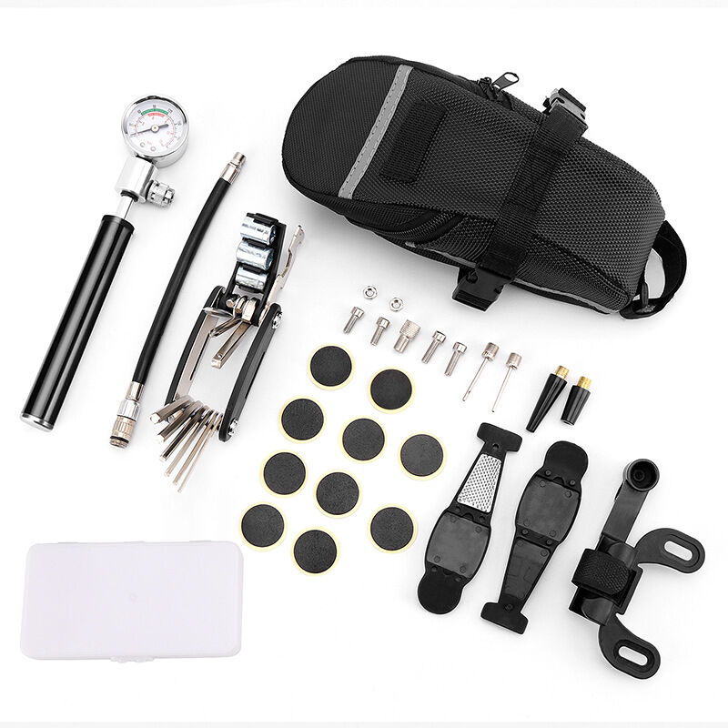 1. 【Kit di attrezzi per bicicletta】: con mini pompa per bici in lega di alluminio, tubo di prolunga della pompa, viti, toppa per pneumatici, leva per bici in acciaio inossidabile, chiave per ossa, valvola di espansione, ago, regolatore dell'aria, borsa per bici nera, tuta per chiave per bici ad alta durezza. 2. 【Pompa per bicicletta portatile】: comoda e compatta. Realizzato con canna in lega di alluminio di alta qualità e parti di precisione, basta svitare l'ugello in senso antiorario a mano o con un piccolo utensile 3. 【Kit di patch per bici comodo e affidabile】: le toppe per pneumatici pre-incollate possono riparare pneumatici forati senza colla extra. Basta applicare la lima sulle parti ruvide del pneumatico e attaccare saldamente la toppa al pneumatico. 4. 【Facile da installare】: il kit bici è facile da installare. 2 cinturini regolabili in velcro e 1 cinturino posteriore semplificano il sistema di installazione e possono essere installati con successo in soli due passaggi. 5.