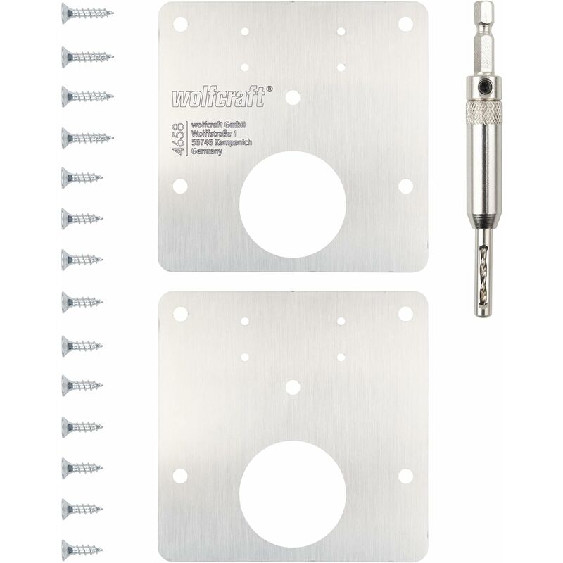 Descrizione del prodotto Questo set di riparazione per cerniere a tazza da 17 pezzi comprende tutti gli utensili e le parti di ricambio di cui avete bisogno per la riparazione di due cerniere strappate dal lato dell'anta dei vostri mobili. Le istruzioni illustrate vi guidano passo dopo passo per aiutarvi a completare il progetto in modo rapido e sicuro. Posizionare la tazza della cerniera nella piastra di montaggio e inserirla nel foro praticato sull'anta. Con la punta autocentrante per cerniere, praticare un foro pilota nei 5 fori previsti nella piastra di montaggio per preparare il fissaggio delle viti. L'utensile consente una foratura guidata in verticale a profondità limitata. In questo modo è possibile avvitare con precisione la piastra nella giusta posizione. Dopo il fissaggio della piastra di montaggio preparare il collegamento a vite della cerniera. Posizionare la punta autocentrante per cerniere nei fori per le viti della cerniera e praticare un foro nel materiale.