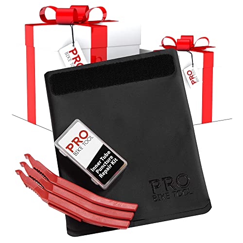 PRO BIKE TOOL Kit di riparazione per foratura, include tre leve per pneumatici, kit patch e borsa impermeabile alla moda, kit di riparazione per tubi accessori per bici con borsa per bici