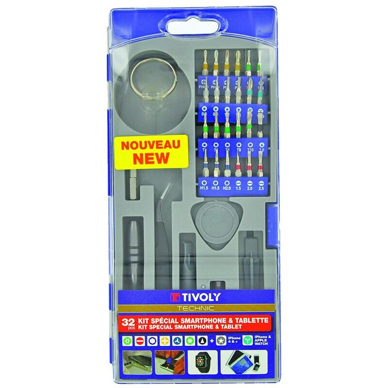 Un set completo di strumenti e punte di cacciavite di precisione progettato per facilitare lo smontaggio di smartphone, tablet, fotocamere ed elettronica di precisione. - Adatto per iPhone e Apple Watch: grazie alle punte specifiche con 'Pentalobe' e 'tripoint' - Pratico: grazie al cacciavite ergonomico in 100% metallo, alla ventosa specifica per lo schermo, agli strumenti di precisione - Fissaggi magnetici HEXA da 4 mm. - Lunga durata grazie all'acciaio al cromo vanadio resistente all'usura delle punte del cacciavite. - TIVOLY Produttore francese Leader mondiale di utensili da taglio, trapani, seghe, lame e spazzole. Gamma TECHNIC per i professionisti più esigenti Scegliere uno strumento è difficile! Come orientarsi? Molti criteri: - Durezza: l'utensile deve essere sufficientemente duro per fissare il materiale, un utensile economico si consumerà senza svolgere il lavoro. - Precisione: un utensile di fascia bassa avrà una precisione del 5%, 10 mm possono diventare 9,95 mm e rendere