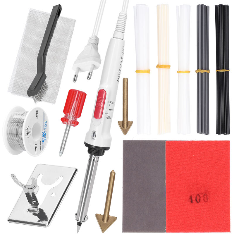 Il modo perfetto per riparare i prodotti più moderni in plastica. Adatto per riparare e rinforzare parti in plastica di tutte le automobili, come paraurti, cruscotti, portalampade, anelli in plastica e forniture quotidiane di plastica. Funzione: Nessuna formazione richiesta. Funzionamento facile e veloce. Design ergonomico per stare in mano. Il modo perfetto per riparare i prodotti più moderni in plastica. Dispositivo di riscaldamento e levigatura piccolo, leggero ma potente. Con la bacchetta di saldatura in plastica e la rete di riparazione, il tuo lavoro di riparazione è più perfetto. È possibile selezionare una varietà di materiali di saldatura, in diverse situazioni, vengono utilizzati materiali diversi per rendere la saldatura più perfetta. Alta temperatura 100W/1076F, bassa temperatura 60W/896F, regolabile. Specifiche: Spina: spina UE, spina USA (opzionale) Dimensioni della rete metallica: 201 * 152 mm / 7,9 * 6,0 pollici Lunghezza cavo di alimentazione: ca. 1,2 m / 47,2 pollici