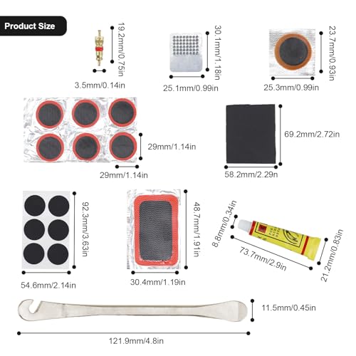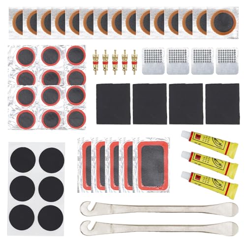 【Kit Riparazione Camera D'aria Bici】 Riceverai 55 pezzi kit riparazione gomme bici, incluse 5 × dell'aria in metallo, 5 × quadrate per pneumatici, 10 × 3,7 cm toppe vulcanizzate rotonde, 15 × 3 cm toppe vulcanizzate rotonde, 6 × pezze per camera d'aria bici rotonde, 4 × lime metalliche, 4 × carta vetrata, 2 × leve per pneumatici in acciaio inossidabile, 3 × fluido vulcanizzante, 1 × scatola di immagazzinaggio. Non è più necessario acquistare accessori aggiuntivi per la bicicletta.