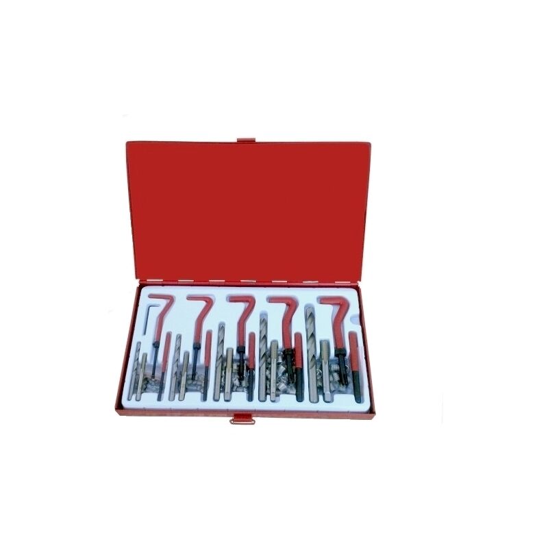 Kit completo 131 pezzi ideale per riparare, ripristinare filetti fillettature danneggiate o usurate dal tempo. Indispensabile per il filo di rinforzo per materiali di bassa resistenza (es.Alluminio). Il Kit abbraccia diversi campi d'applicazione come quel