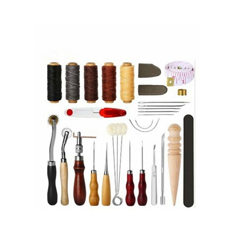 31 kit per cucire a mano: questa riparazione in pelle include 5 rotoli di filo di cera, 2 lettini per le dita, 1 rotolo di righello in tessuto, 1 ditale di rame, 1 set di aghi per cucire a mano (set di 7), 1 tronchese, 1 levigatura stecca, 1 stecca abrasiva, 1 penna incollatrice, 1 scanalatore a U, doppia zucca passa mille pezzi (con gancio), doppia zucca passa mille pezzi, 3 gomitoli di lana, colino mille monete, zucca doppia con mille occhi di cuoio . Strumento fai-da-te: uno strumento manuale fai-da-te molto facile da usare. Molto adatto per misurare la pelle, come cucire pelle, tela, tessuto, carta o altri oggetti. Gli utensili manuali sono molto adatti per il fai da te in pelle o la punzonatura, la riparazione e la cucitura della pelle. Facile da usare: lo strumento per cucire la pelle viene fornito con 2 tipi di goffrature, 4 punzoni per cuciture e una fessura per la pelle, che rende queste pelli più facili da perforare e cucire. Realizzato in acciaio e legno, non è facile da