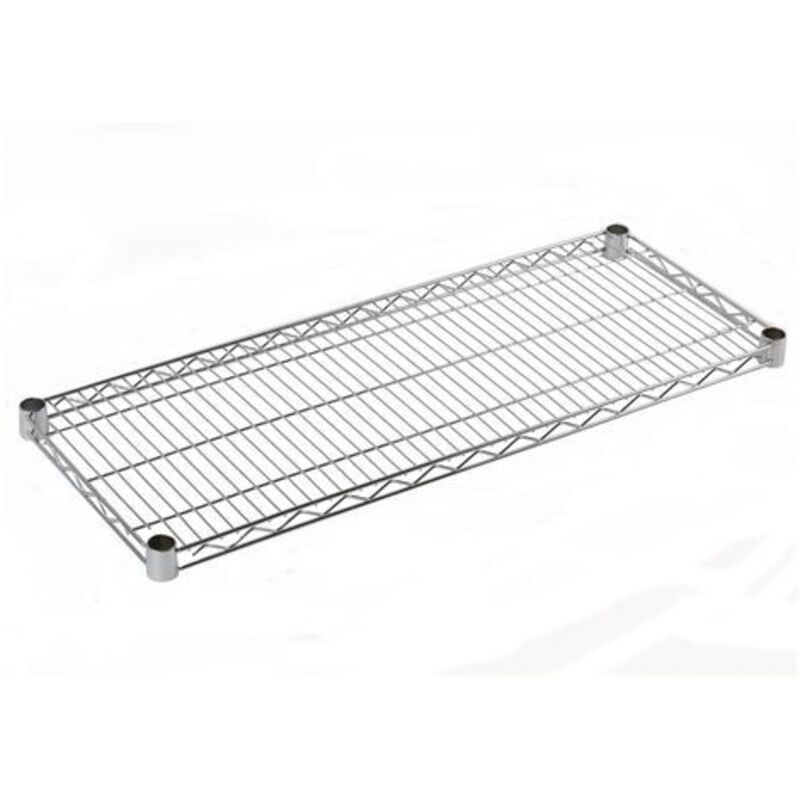 Ripiano in filo d'acciaio cromato, Mis. 46 x 152 cm, completo di guancette per il fissaggio ai tubolari. Può essere regolato all'altezza desiderata in corrispondenza delle apposite scanalature presenti sui tubolari montanti (ogni 2,5 cm). Portata massima: 100 kg (distribuiti). Ripiano rinforzato.