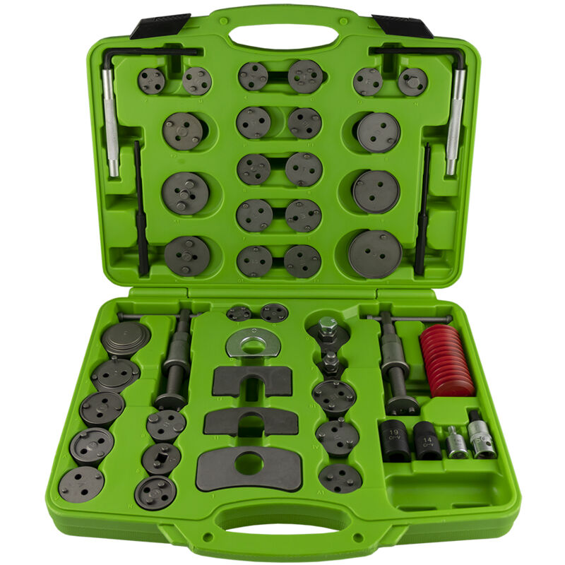 Sistema multiuso da 50 pezzi per riposizionare i pistoncini dei freni. Opel, Citroën, Peugeot, Renault - 3 cuscini di appoggio per spazi limitati - Soffietto con olio lubrificante - Elenco modelli di veicoli e utilizzi - 35 adattatori per veicoli