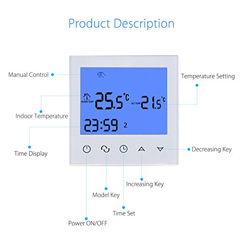 Questo riscaldamento termostato programmabile è adatto per riscaldare pavimento elettronico ed altri elementi di riscaldamento elettrico. Questo nuovo riscaldamento termostato disegno punta su richiesta del mercato, ha ampio display LCD e la funzione WiFi. Facilità d'uso, funzioni complete. Può essere Valvola motorizzata a sfera, valvola motorizzata, valvola termica, elettrovalvola, riscaldatore, film di riscaldamento elettrico, cristallo riscaldamento elettrico carbonio.