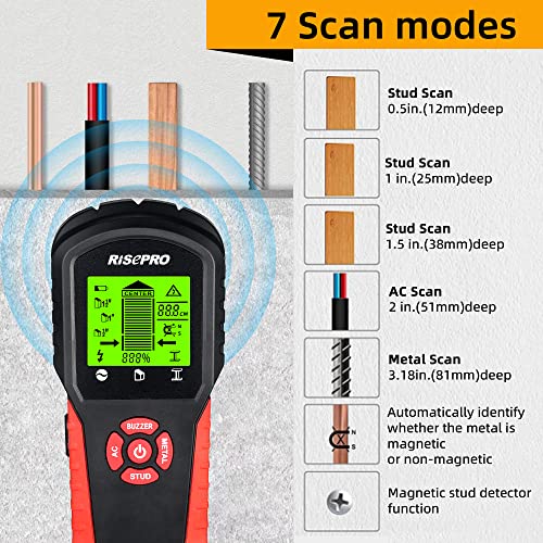 RISEPRO Wall Finder Sensor Scanner, 7 in 1 Sensore elettronico Stud Rilevatori di travetti a travetto Rilevatore di pareti Rilevatore di centri, Avviso sonoro per legno, metallo, AC, rilevamento di fili