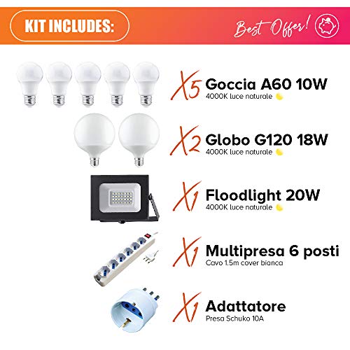 La confezione contiene: 5 Lampadine LED goccia A60 E27 10W 4000K, 2 Lampadina GLOBO G120 E27 18W 4000K;