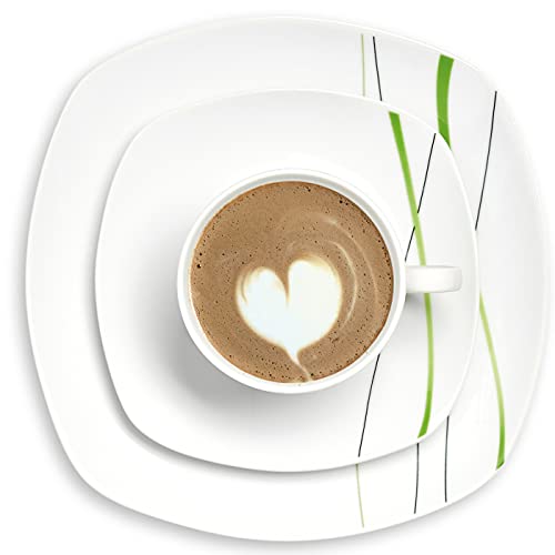 Il set comprende 6 piatti piani, 6 piatti fondi, 6 tazze da caffè, 6 piattini sottotazza e 6 piattini da dolce