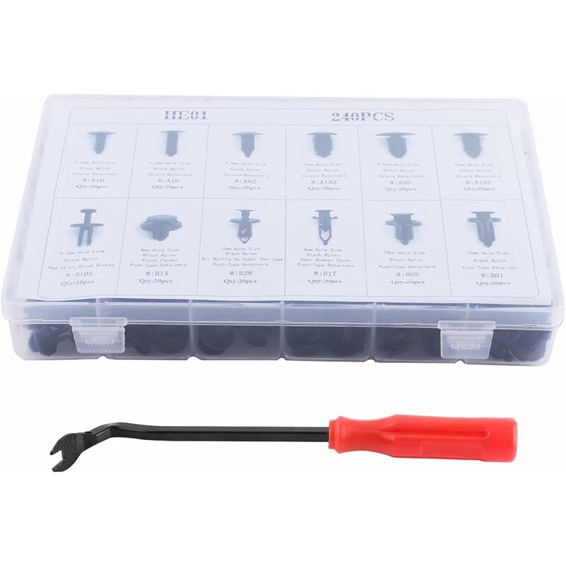 Descrizione: questo pacchetto di clip di montaggio include 240 clip assortite confezionate in una scatola con le dimensioni e le applicazioni più comuni. Fornito con pinze di rimozione per un facile utilizzo. Caratteristiche: Materiale: plastica. Colore: nero. Dimensioni della scatola: 28 x 16,5 x 4,5 cm. Lunghezza della clip: 22,3 cm. Peso della confezione: 660 g Compatibilità: per la maggior parte dei modelli di auto, come Honda Accord Civic CR-V, Toyota Camry Land Cruiser, ecc. Contenuto: 240 clip. 1 pinza per rimuovere le clip.