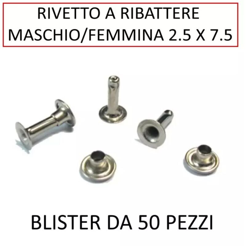 Rivetto a Ribattere Maschio/Femmina, diametro 2.5 mm per una lunghezza totale di 7.5 mm, venduti in Blister da 50 Pezzi Questo particolare tipo di rivetto viene utilizzato per vari scopi, si utilizzano oltre che per unire una o più parti di cuoio, anche per abbellire o decorare borse, scarpe e accessori in pelle e tessuto . DATI TECNICI: - Diametro rivetto 2.5 mm - Lunghezza rivetto 7.5 mm - Diametro testa 7 mm - Blister 50 Pezzi