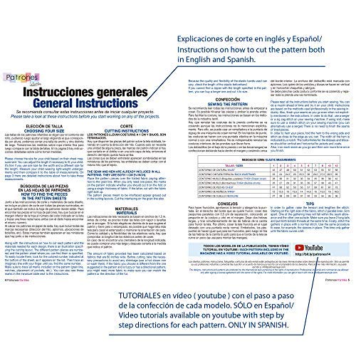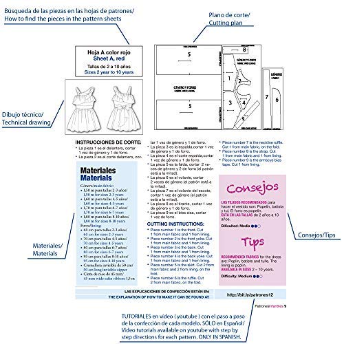 MATERIALI e consumo di tessuto indicato per dimensione per ogni modello. SPIEGAZIONI PER IL TAGLIO in inglese e spagnolo.
