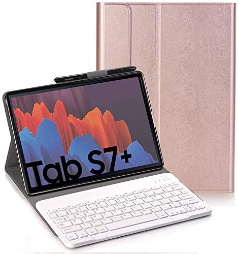 RLTech Tastiera Custodia per Samsung Galaxy Tab S7+, QWERTY Ultra Sottile PU Custodia con Supporto Tastiera Rimovibile Keyboard per Samsung Galaxy Tab S7+ 12.4" T970/975/976 2020, Rosa oro