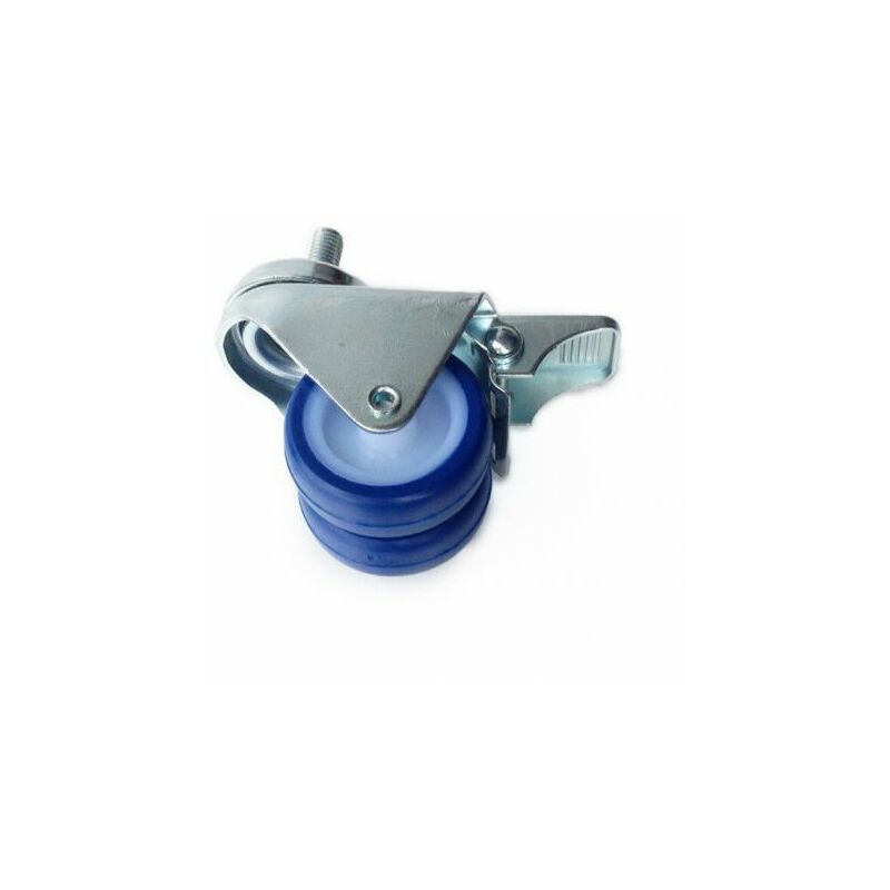 RUOTA PIASTRA GIREVOLE D 50 DOPPIA CON FRENO Supporto girevole a perno filettato, a doppio giro di sfere in acciaio stampato, zincato, con dispositivo di bloccaggio ruota. Doppia ruota in nylon rivestito in poliuretano ad iniezione blu, mozzo a foro passante. Ruota con d.50. perno 10MAx25.