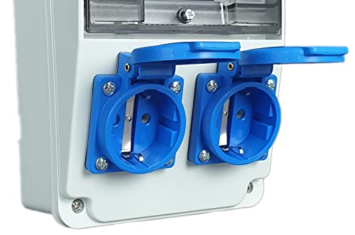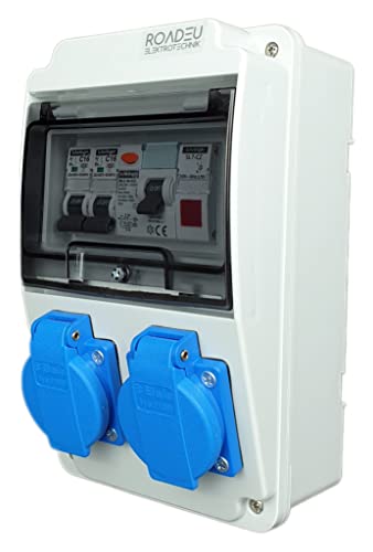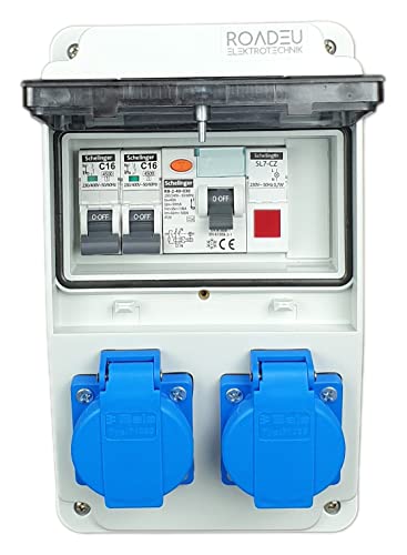 RoadEu - Distributore di corrente 230V, 2x presa Schuko BALS, spia LED rossa, distributore di prese con RCD 40A tipo A/AC, 2x interruttore C16A. Distributore di corrente da cantiere IP44.