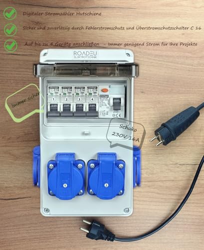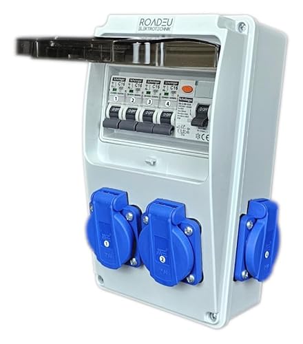 RoadEu - Distributore di corrente 230V, 4 prese BALS Schuko con interruttore, distributore di prese con RCD 40A tipo A/AC, 4x LS C16A. Distributore di corrente da cantiere IP44.