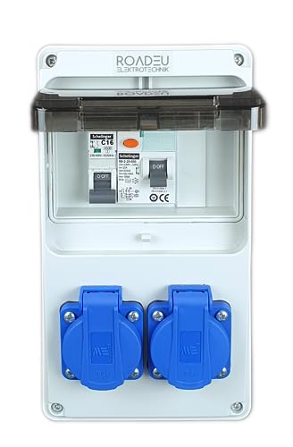 RoadEu - Distributore di corrente 230 V - 2 prese Schuko - Distributore di corrente con interruttore di circuito e interruttore C 16 A - Cablato, distributore di corrente per interni ed esterni IP54