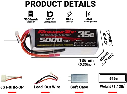 Vantaggio della batteria Lipo Top 5S ruggente】- La batteria lipo RC ruggente è progettata con un'elevata capacità e prestazioni potenti con una velocità di scarica 35C e 5000mAh, che fornirà ai tuoi modelli RC una lunga durata di ciclo e una maggiore durata per il divertimento.