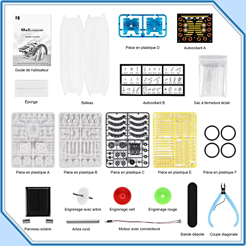 Kit robot solare 13 in 1: Il robot a energia solare può essere trasformato in 13 diversi robot che possono muoversi sulla terra o sull'acqua per essere costruiti dai tuoi bambini. Due livelli di complessità: livello base e livello avanzato, sfida le loro abilità manipolative!
