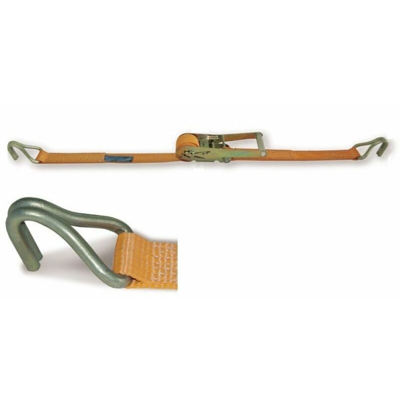 100% poliestere, fascia piana a doppio strato con agganci rinforzati, con cricchetto per regolare la tensione e ganci per il carico, alta resistenza, fattore di sicurezza 7:1, a norma EN 12195-2:2001. cod. 29443 mm. 50x8,5 mt. cf/pz 1