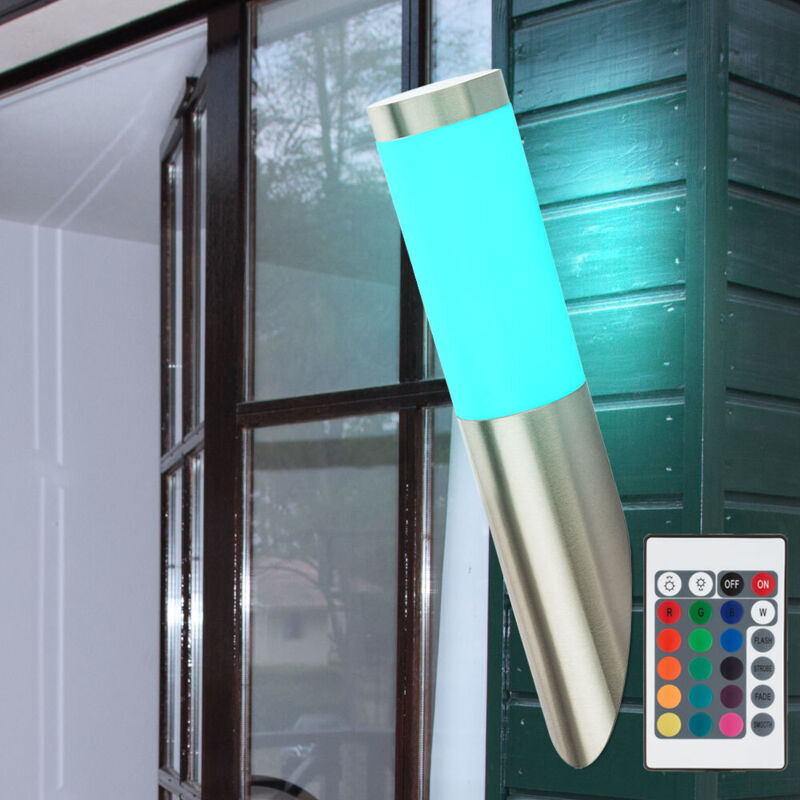 Descrizione Elegante lampada da parete per esterni Questa robusta lampada da esterno in acciaio inossidabile è perfetta per migliorare l'illuminazione della tua proprietà. Non solo il design senza tempo, ma anche la luminosità convince L'apparecchio è certificato secondo la classe di protezione IP44 e protetto contro gli spruzzi d'acqua. Quindi può essere utilizzato ovunque all'aperto senza esitazione. La funzione di memoria del telecomando RGB ricorda l'ultima impostazione del colore utilizzata. Se lo preferisci dimmed invece che sgargiante, nessun problema, grazie al telecomando hai ja tutto in mano. LED le lampade consumano solo una quantità minima di elettricità e hanno un consumo persino inferiore rispetto alle lampade a risparmio energetico. Questo protegge l'ambiente e il tuo portafoglio. Una lampada LED RGB di alta qualità da 7 watt con telecomando per luce bianca e controllo RGB è inclusa nella fornitura. Dettagli • Tipo apparecchio: applique • struttura: acciaio inox
