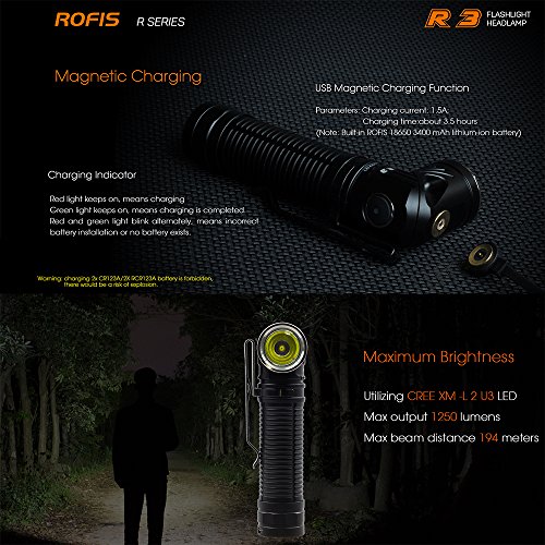 Rofis R3 EDC Torcia/Lampada Frontale CREE XM-L2 LED Bianco Freddo 1250 lumen Testa Girevole Regolabile illuminazione Torce Elettriche USB Magnetica Ricaricabile con 18650 batteria