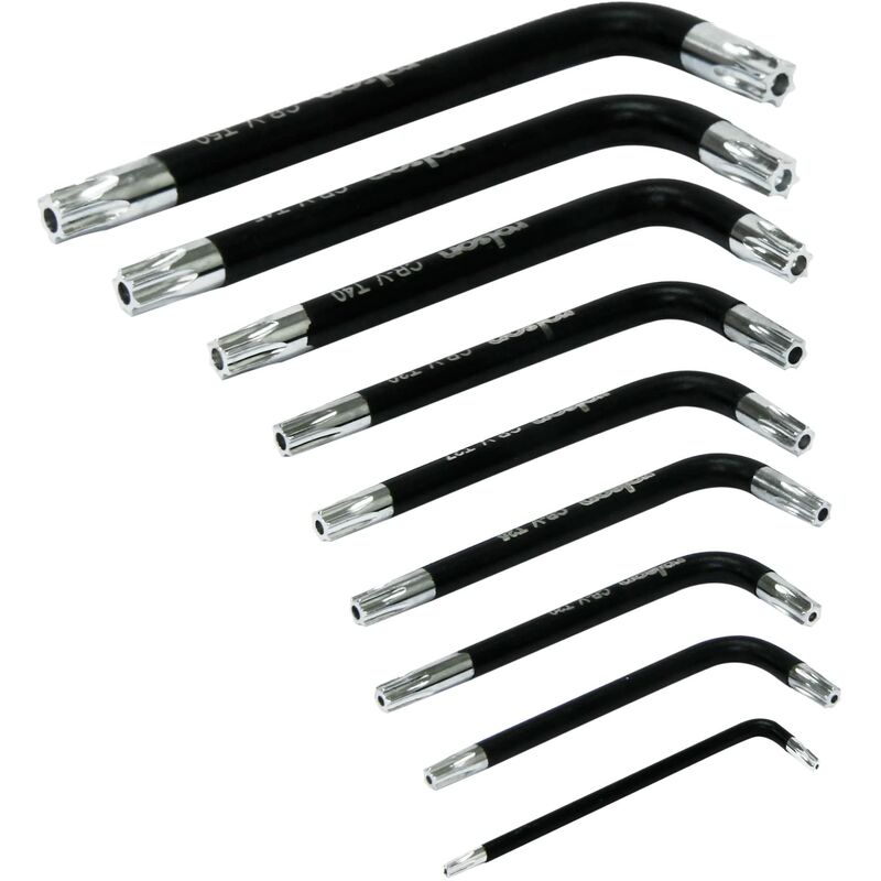 Il set Rolson 40373 di Torx a braccio corto è un set di chiavi ideale per casa o sul posto di lavoro. Caratteristiche: Misure T10, T15, T20, T25, T27, T30, T40, T45, T50. Le immagini hanno scopo puramente illustrativo.
