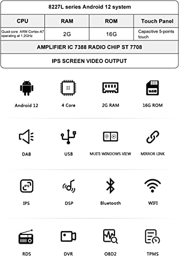 Alimentato dall'ultimo sistema operativo Android 12: Modulo radio standard per auto: ST7708 Forte capacità anti-interferenza, buona ricezione del segnale radio. Chip dell'amplificatore di potenza: IC 7388 Effetti audio ad alta fedeltà e potenti. Processore CPU: 1,2 GHz * 4 core processore ARM Cortex-A7 ROM 16 GB di RAM 2 GB di memoria RAM DDR3 ad alta capacità offrono l'esperienza migliore e più fluida.