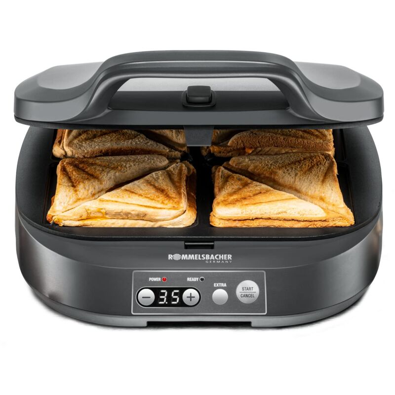 Il sandwich Maker ST 1800 è un efficace aiuto in cucina, che in un attimo evoca quattro pasti caldi per snack. È perfetto per godersi rapidamente e comodamente gli amanti dei sandwich grandi e piccoli con specialità croccanti e succosi di sandwich. Gli stampi antiaderenti offrono molto spazio per 4 panini American XL. Il potente dispositivo si riscalda in pochi minuti ed è facile da usare tramite tasti soft touch, il display LED offre una buona panoramica. Le piastre tostapane in alluminio pressofuso distribuiscono il calore in modo ottimale e garantiscono una tostatura intensa con design a conchiglia sui fette di tostato. Un timer consente di impostare i tempi di cottura individuali e la funzione dorata consente di ottenere una tostatura ancora più intensa premendo un pulsante. Per la sicurezza nell'uso, lo spegnimento automatico, l'alloggiamento Cool-Touch, una protezione contro il surriscaldamento e i piedini antiscivolo. Il rivestimento antiaderente consente inoltre una facile