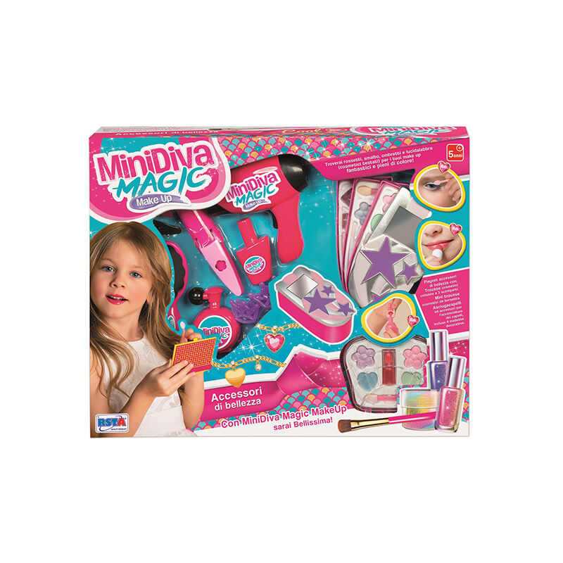 Scegli il tuo make up preferito con la trousse Minidiva, con cellulare e phon. Troverai: rossetti, smalto, ombretti, lucidalabbra per i tuoi make up fantastici e pieni di colore.