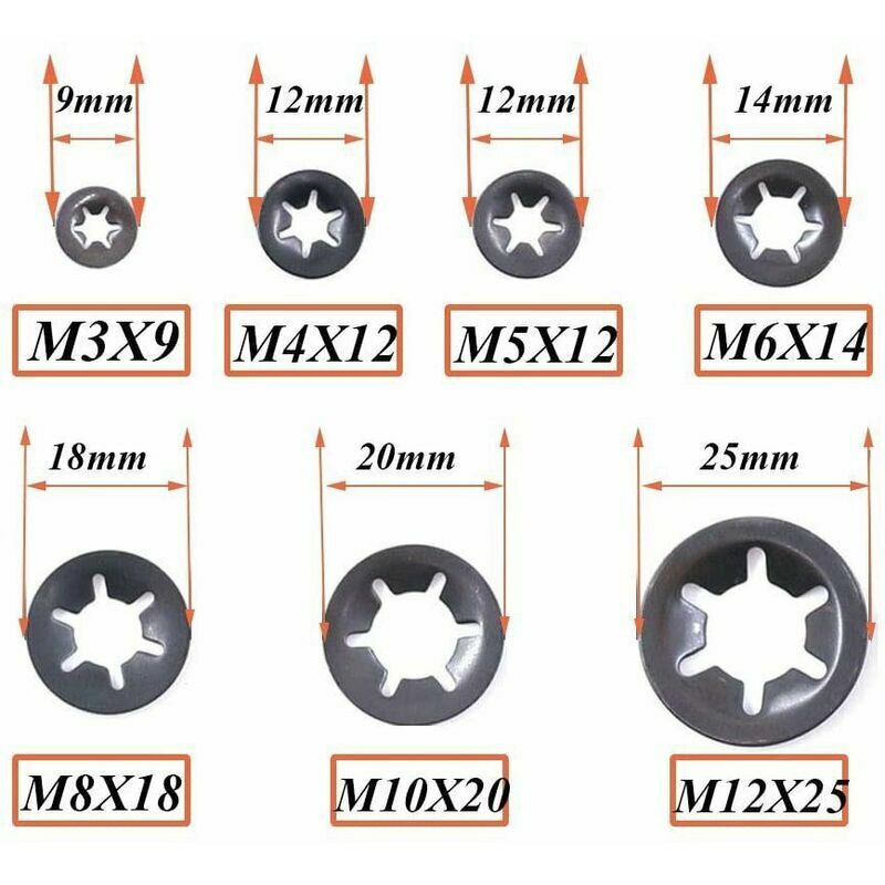 La confezione include: Rondella Starlock da 340 pezzi Scatola di plastica da 1 pezzo Dimensioni come di seguito: 60 pezzi: M3 > 60 PEZZI: M4 60 PEZZI: M5 50 PEZZI: M6 50 PEZZI: M8 40PZ: M10 20PCS: M12 Specifica: Nome: Rondelle dentellate interne Starlock Materiale: acciaio metallico 65Mn < p>Colore nero Misura: M3, M4, M5, M6, M8, M10, M12 Quantità: 340 pezzi