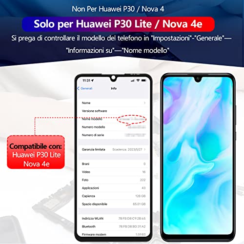 Compatibilità - Display LCD per 6.15" Huawei P30 Lite MAR-L01A MAR-L21A MAR-LX1A Ricambio(Non per Huawei P30). Assicurati che il modello del tuo telefono prima dell'acquisto.