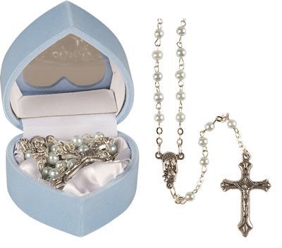 Rosario per bambina, ideale come regalo di battesimo, colore: blu perlato, compreso un opuscolo in lingua inglese dal titolo "How to Pray the Rosary" [lingua italiana non garantita]
