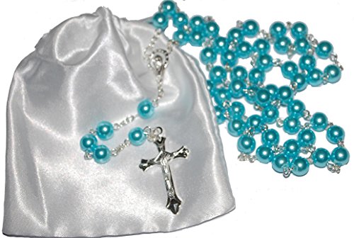 Rosario per la prima comunione - bellissimo regalo per la prima comunione - splendido set regalo per ragazze o ragazzi, ottima qualità con crocifisso argentato, catena con perline effetto perla fornita con sacchetto di raso bianco con coulisse, per tutte le occasioni religiose, tra cui compleanno, nuovo bambino, festa del papà, Natale, baby shower, anniversario commemorativo, battesimo, cresima. Adatto a tutte le età.