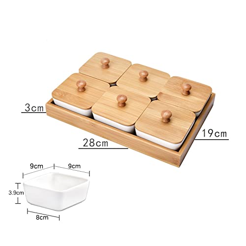 RoseFlower Set Aperitivo Moderno con Coperchi - 6 Pezzi Ciotoline quadrate con Supporto Bambù - Finger Food Contenitori per Salse Snack antipasti Dessert - Ciotoline Ceramica Casa, Porcelain, White